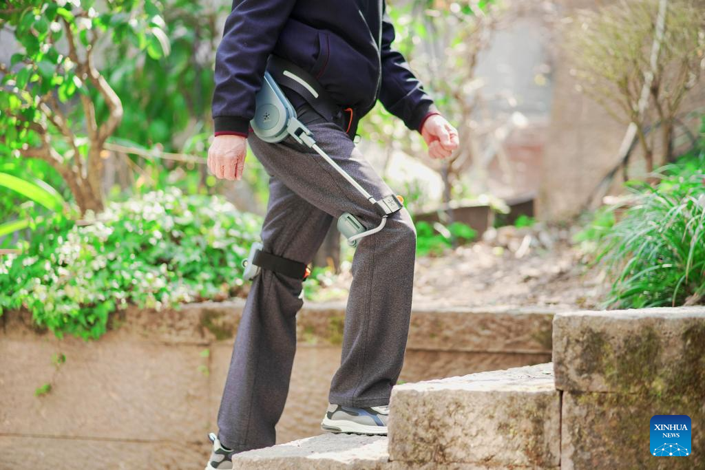 A senior citizen wearing an exoskeleton walking aid device climbs the stairs in Hangzhou, east China's Zhejiang Province, Feb. 24, 2025. (RoboCT/Handout via Xinhua)