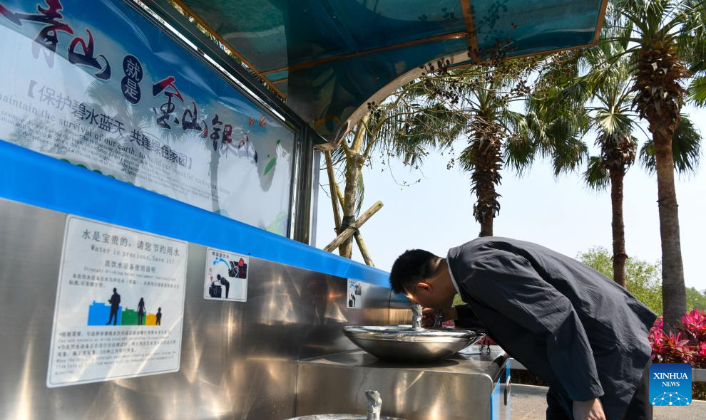 An attendee drinks direct drinking water in the Boao zero-carbon demonstration zone in Boao, south China's Hainan Province, March 25, 2025. China's Boao has announced the establishment of its first zero-carbon zone, a significant step forward in the country's pursuit of low-carbon development, according to authorities in Hainan. (Xinhua/Yang Guanyu)