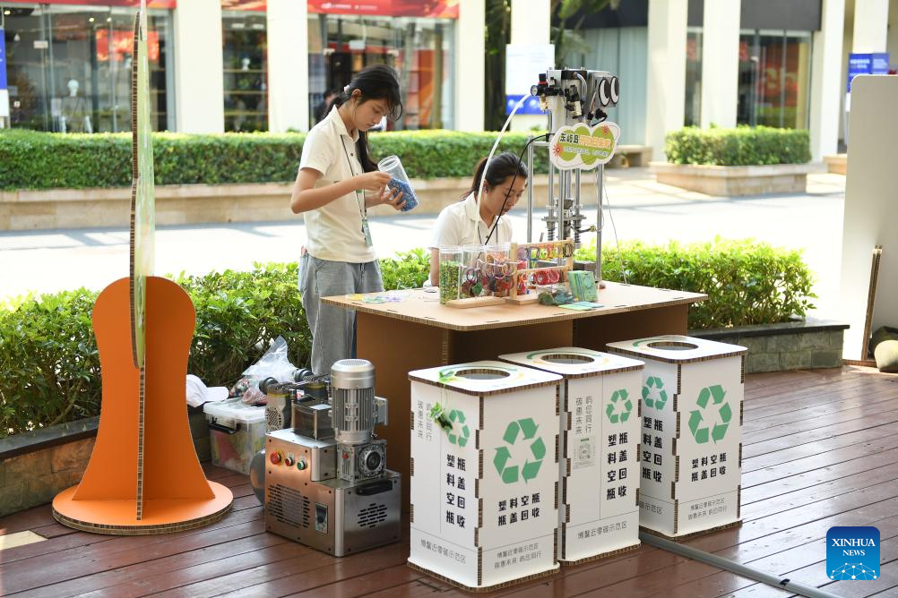 Staff members demonstrate the procedure of plastic recycling in the Boao zero-carbon demonstration zone in Boao, south China's Hainan Province, March 25, 2025. China's Boao has announced the establishment of its first zero-carbon zone, a significant step forward in the country's pursuit of low-carbon development, according to authorities in Hainan. (Xinhua/Xie Ziyi)