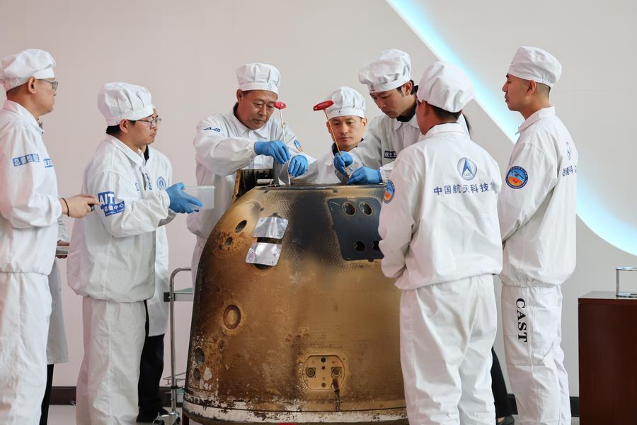 The returner of the Chang'e-6 lunar probe is opened during a ceremony at the China Academy of Space Technology under the China Aerospace Science and Technology Corporation in Beijing, capital of China, June 26, 2024. (Xinhua/Jin Liwang)