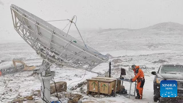 This photo taken in January 2024 shows "Three Gorges Antarctic Eye," a 3.2-metre aperture radio/millimetre-wave telescope, at China's Zhongshan Station in Antarctica. (China Three Gorges University/Handout via Xinhua)