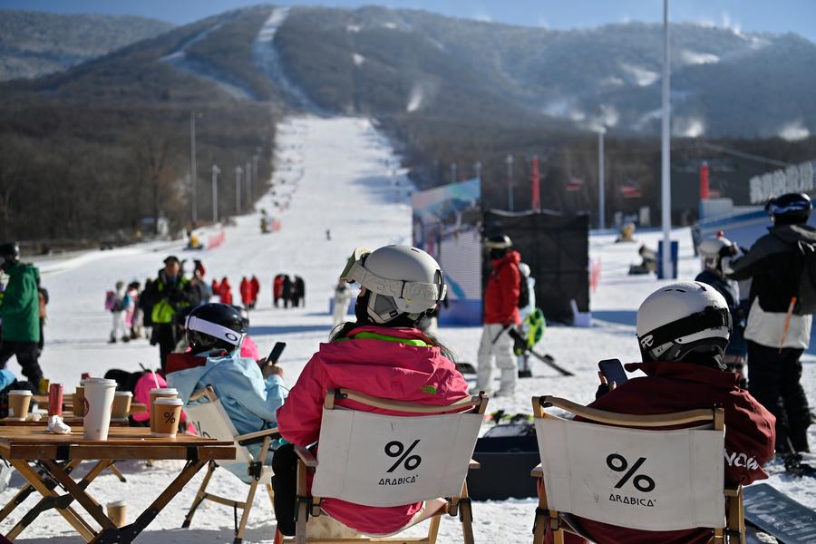 Skiers take a rest outside a cafe at the Beidahu Ski Resort in Jilin City, northeast China's Jilin Province, on Nov. 23, 2024. (Xinhua/Yan Linyun)