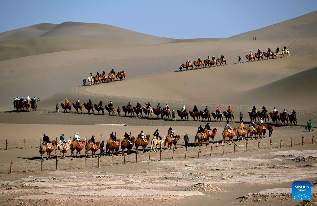 Tourists enjoy camel rides at the Mingsha Mountain and Crescent Spring scenic spot in Dunhuang, northwest China's Gansu Province, April 5, 2025. China recorded 126 million domestic trips during the three-day Qingming Festival holiday that ended Sunday, a 6.3 percent increase from the previous year, according to data released by the Ministry of Culture and Tourism on Monday.(Photo by Zhang Xiaoliang/Xinhua)