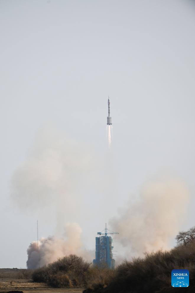 The Shenzhou-20 crewed spaceship, atop a Long March-2F carrier rocket, blasts off from the Jiuquan Satellite Launch Center in northwest China, April 24, 2025. China successfully launched the Shenzhou-20 crewed spaceship on Thursday, sending three astronauts to its orbiting space station for a six-month mission. (Xinhua/Ma Jinrui)