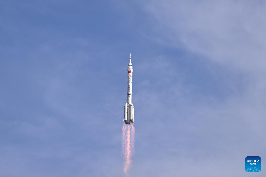 The Shenzhou-20 crewed spaceship, atop a Long March-2F carrier rocket, blasts off from the Jiuquan Satellite Launch Center in northwest China, April 24, 2025. China launched the Shenzhou-20 crewed spaceship on Thursday, sending three astronauts to its orbiting space station for a six-month mission. (Xinhua/Li Xin)