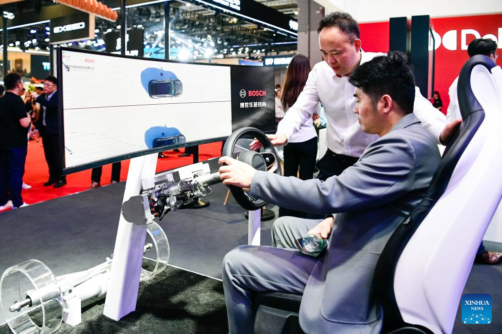 A visitor tries a steering system solution of Bosch Huayu at the 21st Shanghai International Automobile Industry Exhibition in east China's Shanghai, April 25, 2025. Themed "Embracing Innovation, Empowering the Future," the exhibition, also known as Auto Shanghai 2025, kicked off here on Wednesday, attracting nearly 1,000 noted enterprises from 26 countries and regions. In addition to new models debuting, automakers also seized the stage with their latest intelligent vehicle technologies, including intelligent driving, artificial intelligence (AI) system, and smart cockpits. (Xinhua/Wang Xiang)