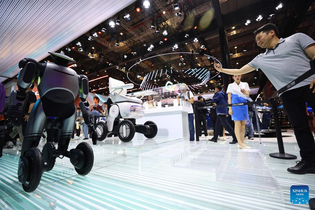 A visitor takes photos of robots displayed at the booth of GAC Group at the 21st Shanghai International Automobile Industry Exhibition in east China's Shanghai, April 25, 2025. Themed "Embracing Innovation, Empowering the Future," the exhibition, also known as Auto Shanghai 2025, kicked off here on Wednesday, attracting nearly 1,000 noted enterprises from 26 countries and regions. In addition to new models debuting, automakers also seized the stage with their latest intelligent vehicle technologies, including intelligent driving, artificial intelligence (AI) system, and smart cockpits. (Xinhua/Fang Zhe)