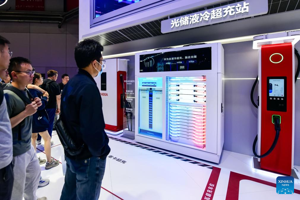 People view liquid-cooled supercharger of Huawei at the 21st Shanghai International Automobile Industry Exhibition in east China's Shanghai, April 25, 2025. Themed "Embracing Innovation, Empowering the Future," the exhibition, also known as Auto Shanghai 2025, kicked off here on Wednesday, attracting nearly 1,000 noted enterprises from 26 countries and regions. In addition to new models debuting, automakers also seized the stage with their latest intelligent vehicle technologies, including intelligent driving, artificial intelligence (AI) system, and smart cockpits. (Xinhua/Wang Xiang)