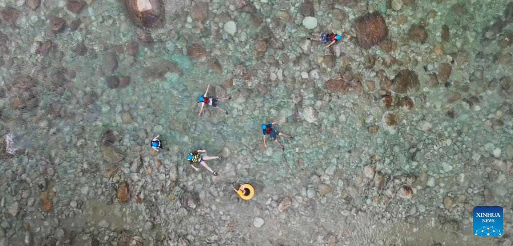 An undated aerial drone photo shows tourists "Wimp Rafting" in Mao'er Mountain Scenic Area, Guilin, south China's Guangxi Zhuang Autonomous Region. (Xinhua)