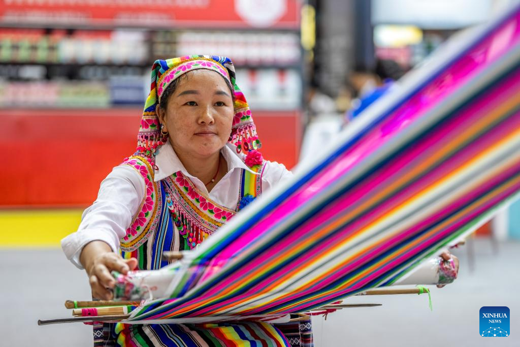 A woman of Dulong ethnic group weaves a Dulong blanket during the 9th China-South Asia Expo in Kunming, southwest China's Yunnan Province, June 19, 2025. (Xinhua/Hu Chao)
