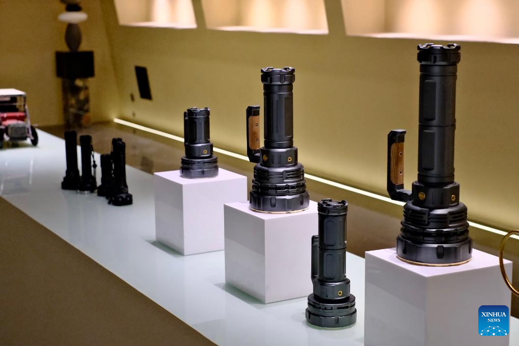 This photo taken in April 2025 shows flashlights displayed at a product showroom of Black Forest Electronic Technology Co., Ltd. in Ningbo, east China's Zhejiang Province. (Black Forest Electronic Technology Co., Ltd./Handout via Xinhua)