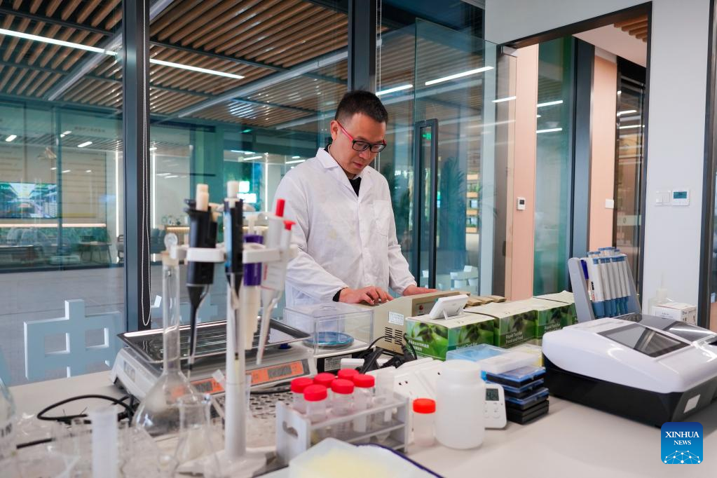 A researcher conducts experiment at the Tianfu Agricultural Expo Park in Chengdu, southwest China's Sichuan Province, April 10, 2025. (Xinhua)