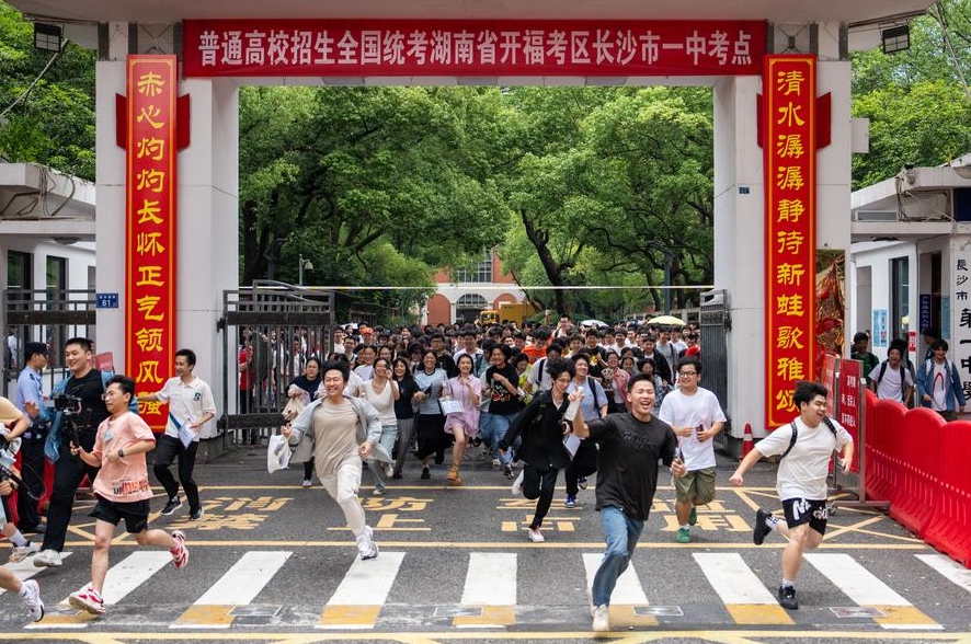 Students celebrate after the exam at a national college entrance examination site in Changsha, central China's Hunan Province, June 9, 2025. (Xinhua/Chen Sihan)