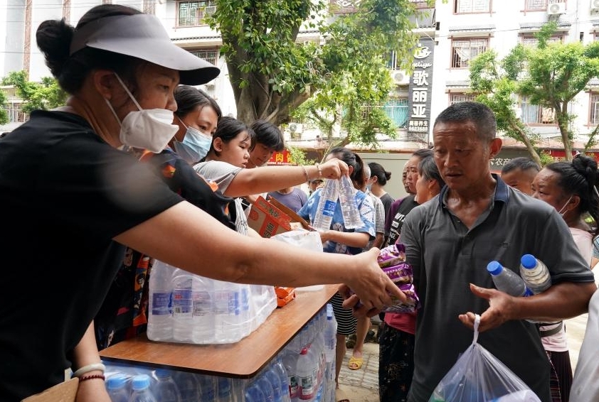 Volunteers hand out emergency food aid in the flood-stricken Rongjiang County, southwest China's Guizhou Province, June 29, 2025. Heavy flooding has returned to Rongjiang County in southwest China's Guizhou Province, prompting local authorities to re-activate the highest-level emergency flood response, effective from 12:30 p.m. Saturday.
