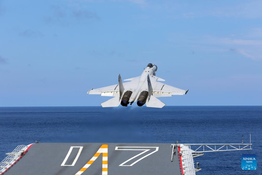 This photo shows a fighter jet taking off from an aircraft carrier. China's naval formations of two aircraft carriers, Liaoning and Shandong, have completed their far-sea combat-oriented training and safely returned to their home ports, according to the Chinese navy on Monday. (Photo by Wang Jian/Xinhua)