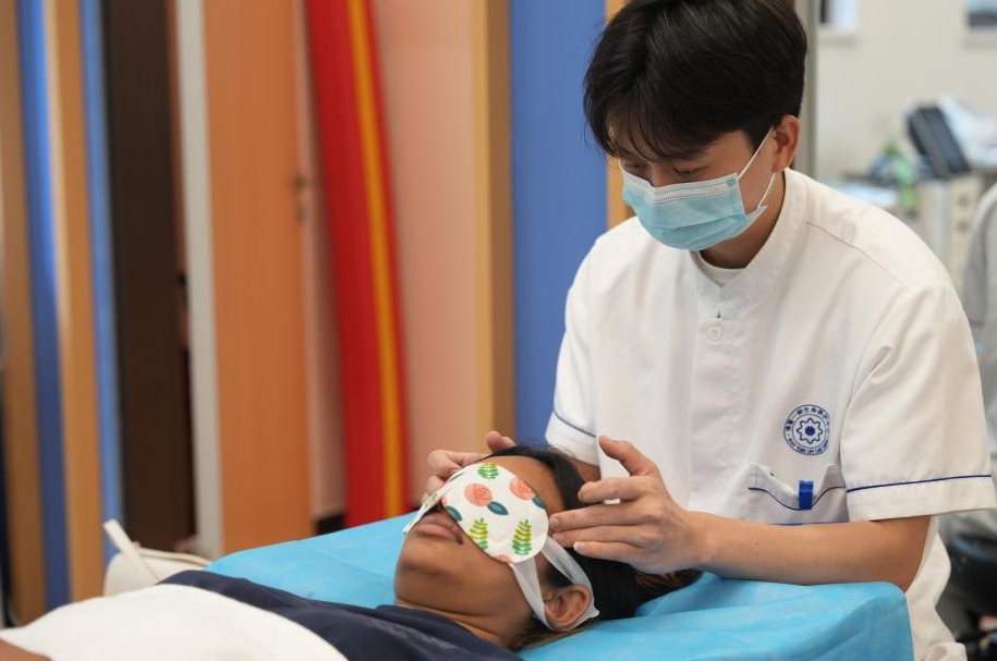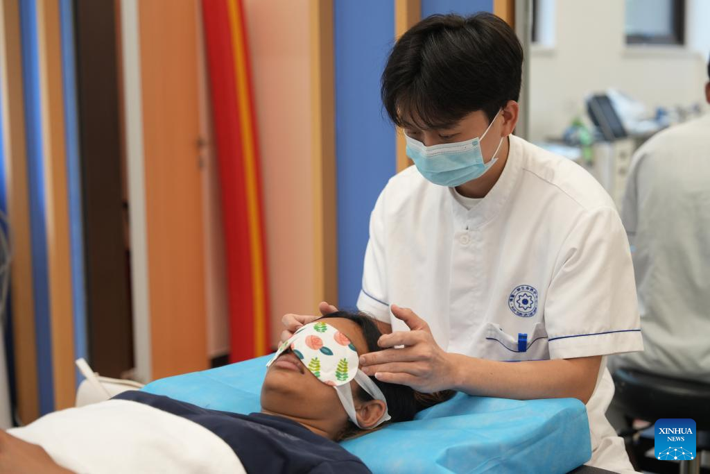 A medical worker gives massage to a Canadian visitor at the Boao Yiling Life Care Center in Boao, a coastal town of south China's Hainan Province, June 13, 2025. (Xinhua)