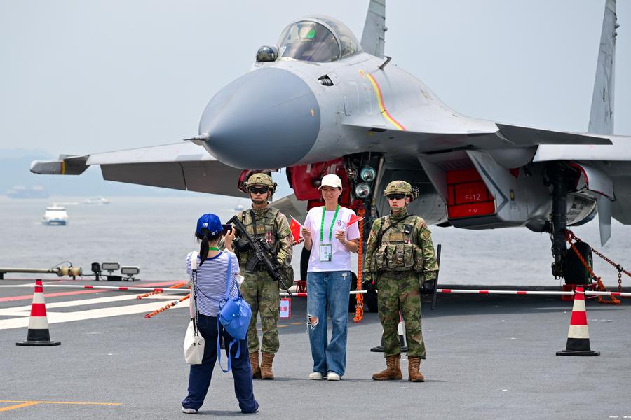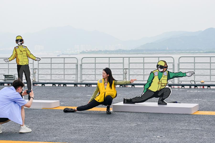 A visitor poses for a photo while visiting the aircraft carrier Shandong in Hong Kong, south China, July 5, 2025. (Xinhua/Zhu Wei)