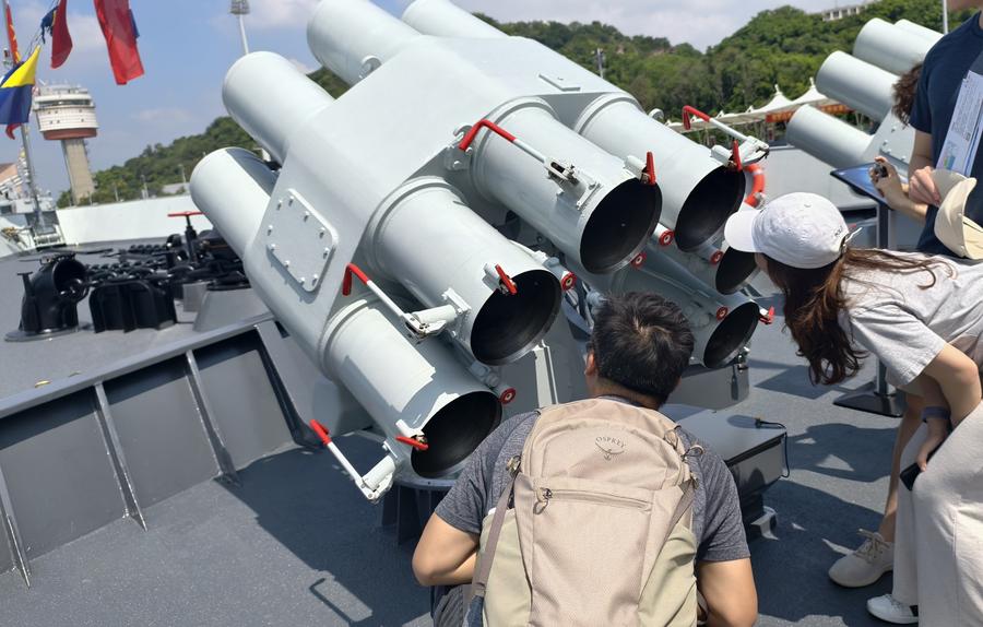 People visit the Yuncheng missile frigate in Hong Kong, south China, July 5, 2025. (Photo by Huang Qiantian/Xinhua)