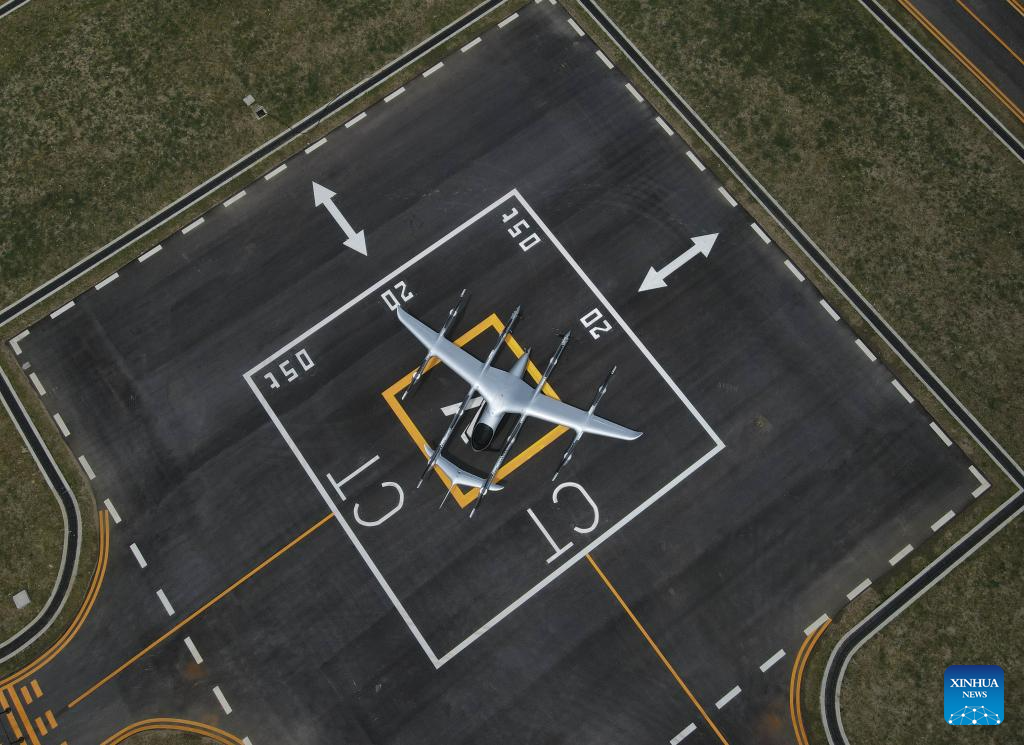 An aerial drone photo taken on July 22, 2025 shows the V2000CG CarryAll, a tonne-class electric vertical takeoff and landing (eVTOL) aircraft on the apron in Kunshan, east China's Jiangsu Province. (Xinhua/Fang Zhe)