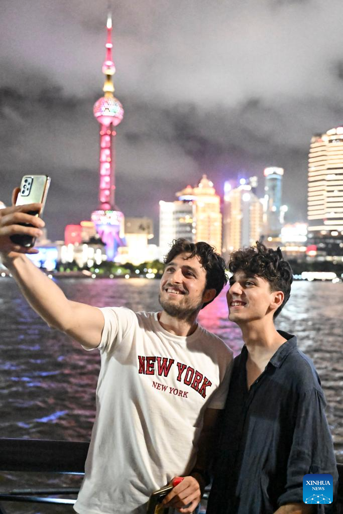 Tourists Alfredo Cimmino (L) and Giulio Bartoli from Italy take a selfie with Shanghai Oriental Pearl Tower at the Bund area in Shanghai, east China, July 18, 2025. Thanks to China's visa-free policies and related measures, the popularity of both travel and shopping in China among foreigners has risen, serving as a boost to the country's tourism development.