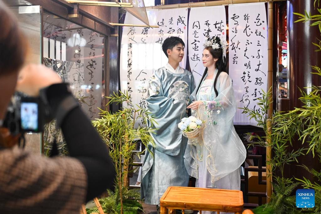Tourists from Austria wearing Hanfu attires pose for photos at Yuyuan Garden Mall in Shanghai, east China, July 21, 2025. Thanks to China's visa-free policies and related measures, the popularity of both travel and shopping in China among foreigners has risen, serving as a boost to the country's tourism development.