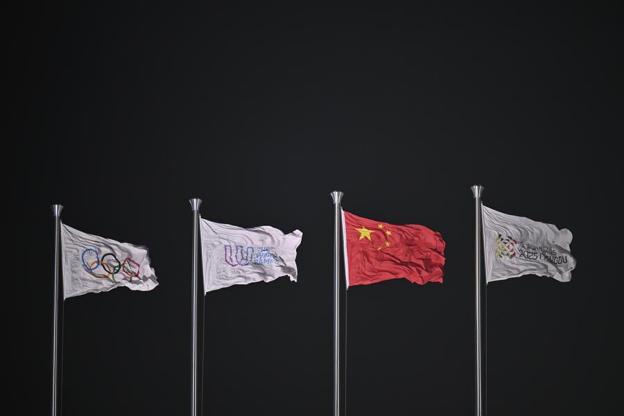 The flag of the International Olympic Committee, the flag of the International World Games Association, the Chinese national flag and the flag of the Organising Committee of the World Games 2025 Chengdu (L to R) are seen during the opening ceremony of the World Games 2025 in Chengdu, southwest China's Sichuan Province, on Aug. 7, 2025. (Xinhua/Chen Zhenhai)