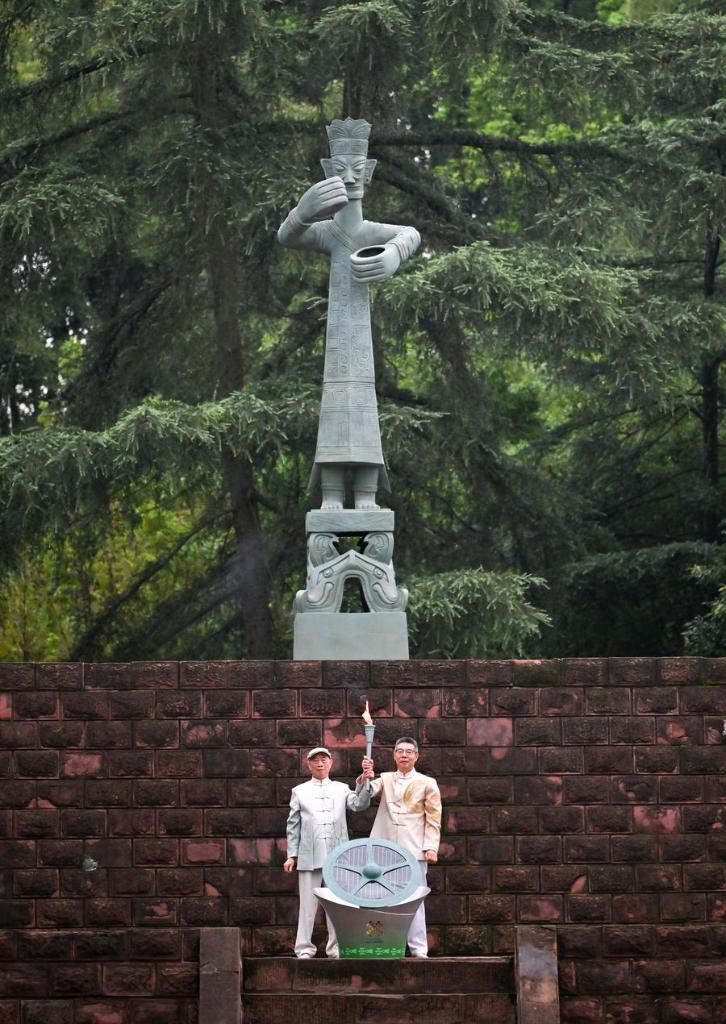 Xiao Xianjin (L), representative of Sanxingdui Museum, and Zhu Zhangyi, representative of Jinsha Site Museum, display the flame during the flame lighting ceremony before the World Games 2025 Torch Relay in Deyang, southwest China's Sichuan Province, July 26, 2025. (Xinhua/Liu Kun)