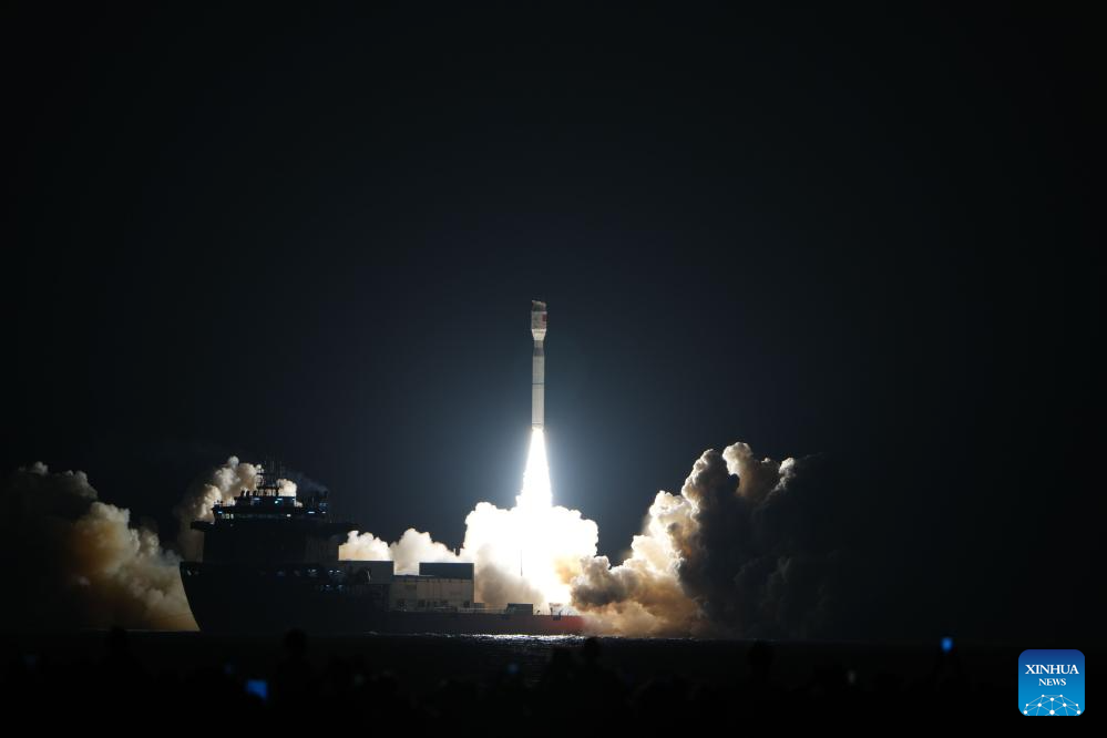 A Smart Dragon-3 (SD-3) rocket carrying the Geely-04 constellation of satellites lifts off from sea near the city of Rizhao, in east China's Shandong Province, Aug. 9, 2025. (Photo by Guo Jinqi/Xinhua)