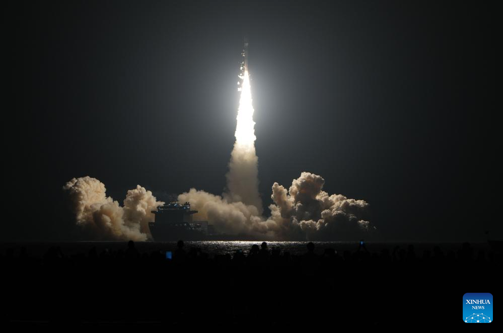 A Smart Dragon-3 (SD-3) rocket carrying the Geely-04 constellation of satellites lifts off from sea near the city of Rizhao, in east China's Shandong Province, Aug. 9, 2025. (Photo by Guo Jinqi/Xinhua)