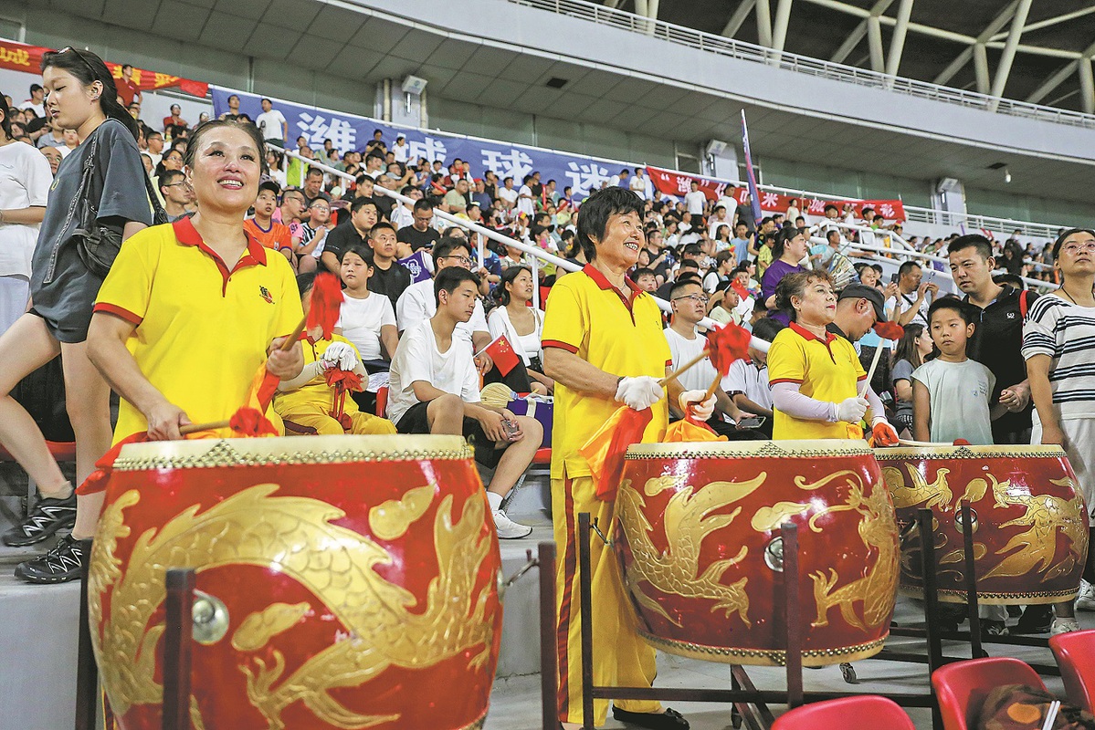 Fans play drums and cheer from the stands during the first round of the Victory Football Super Cup match between teams representing Weicheng and Kuiwen districts in Weifang on July 2. WANG BIN/CHINA NEWS SERVICE