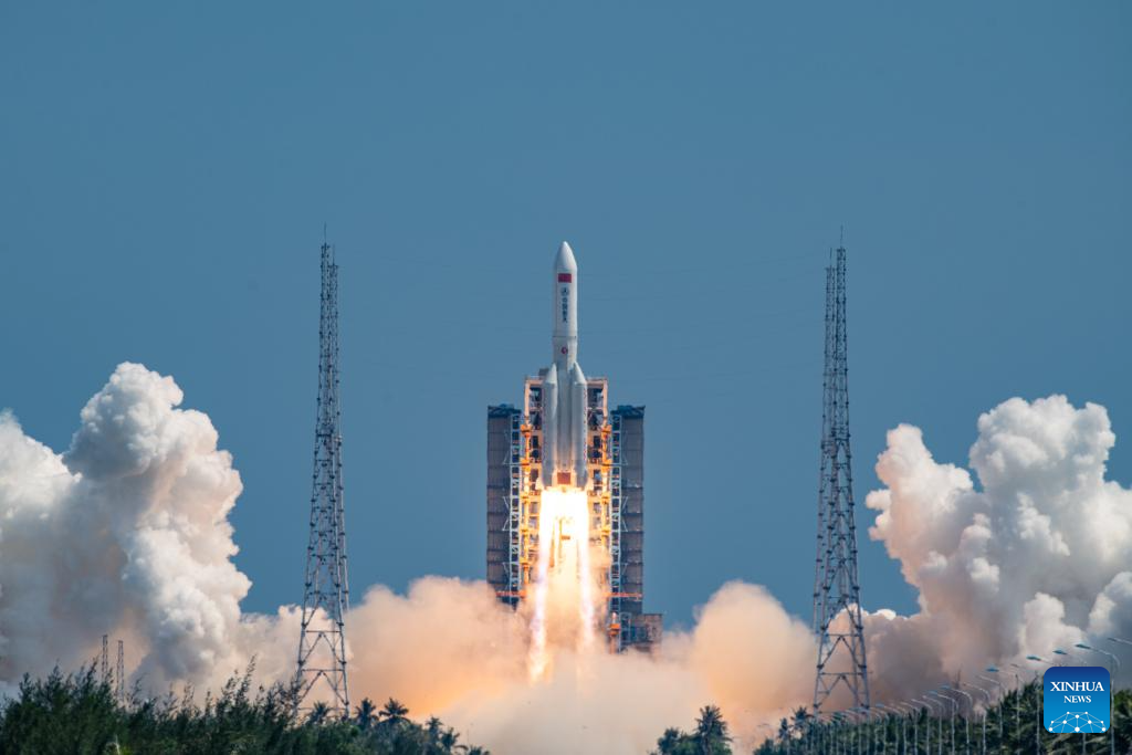 A Long March-5B carrier rocket carrying a group of low Earth orbit satellites blasts off from the Wenchang Space Launch Site in south China's Hainan Province, Aug. 13, 2025. This satellite group, the eighth of its kind that will constitute an internet constellation, was launched at 2:43 p.m. (Beijing Time) aboard a Long March-5B carrier rocket, featuring a Yuanzheng-2 (Expedition-2) upper stage at the top of the rocket. (Photo by Du Xinxin/Xinhua)