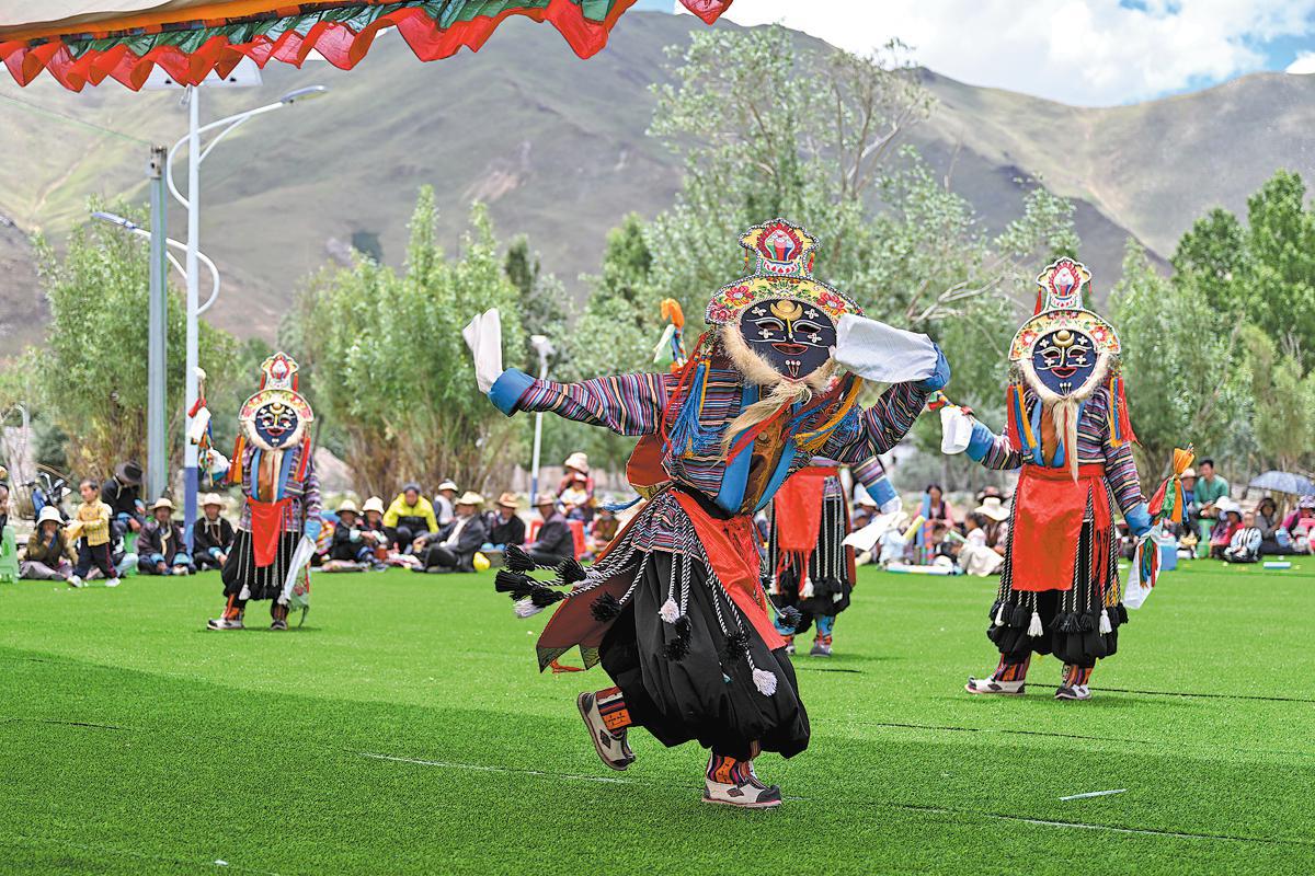 Members of a local troupe perform Tibetan Opera at a park in Namling county, Xizang autonomous region, on July 17. LI XIN/XINHUA