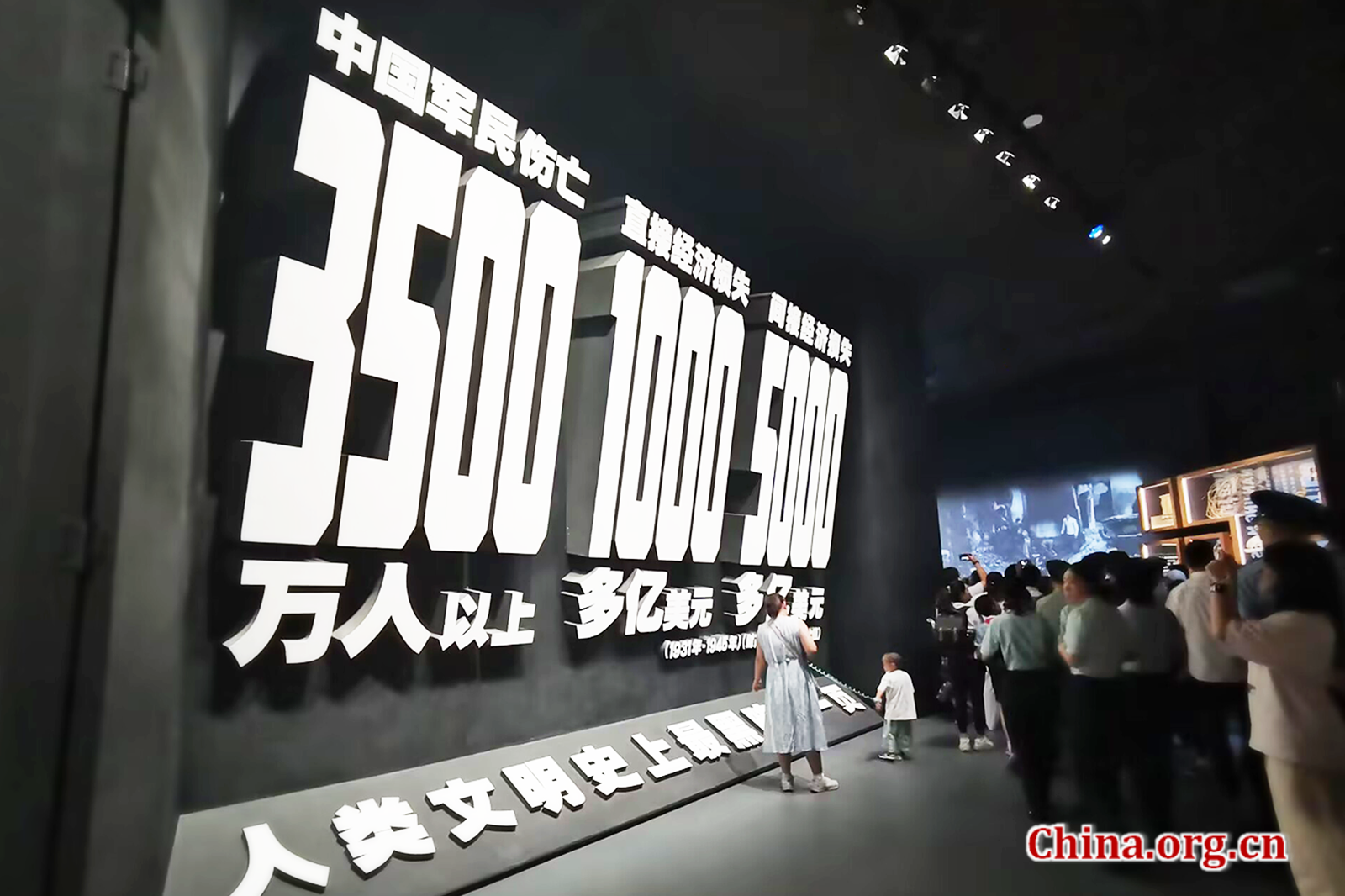 Visitors pause at an installation in the museum in Beijing, Aug. 14, 2025. The installation shows China's toll in the War of Resistance Against Japanese Aggression — over 35 million military and civilian casualties, over $100 billion in direct economic losses, and over $500 billion in indirect economic losses. [Photo by Zhang Jiaqi/China.org.cn]