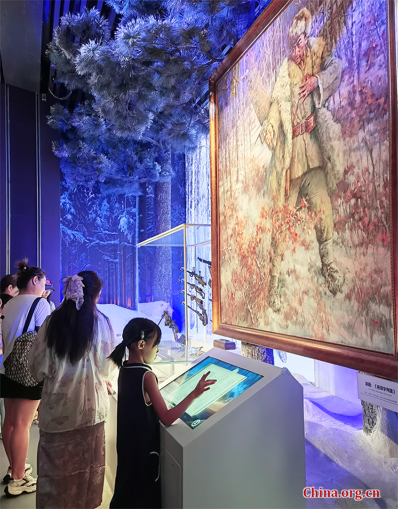 A girl browses heroic stories on an interactive screen beside the portraits of the war hero Yang Jingyu, Aug. 14, 2025. [Photo by Zhang Jiaqi/China.org.cn]