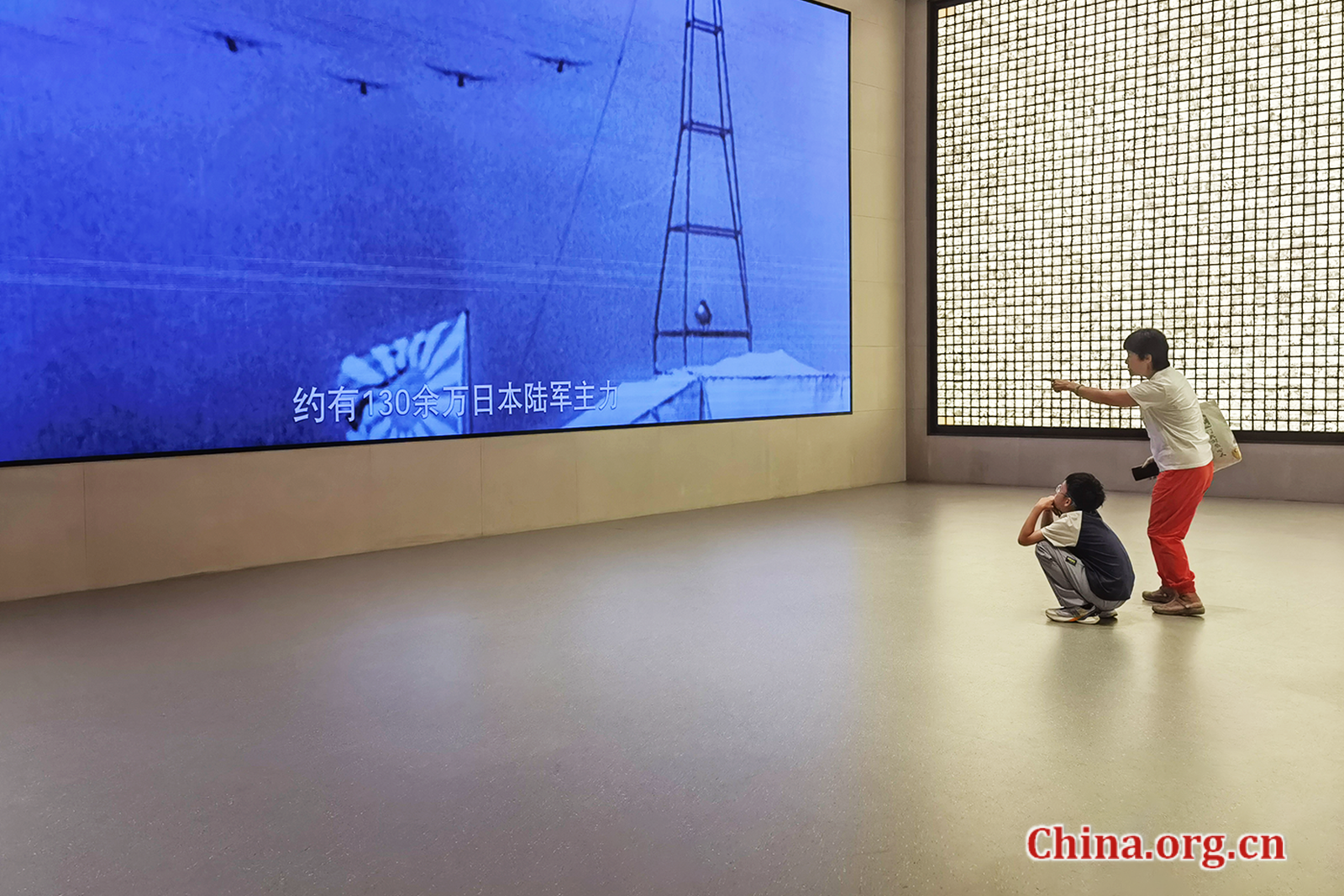 On Aug. 14, 2025, visitors watch a video explaining how China's arduous struggle against Japanese aggression provided strategic support for smashing fascists' plot to dominate the world. [Photo by Zhang Jiaqi/China.org.cn]