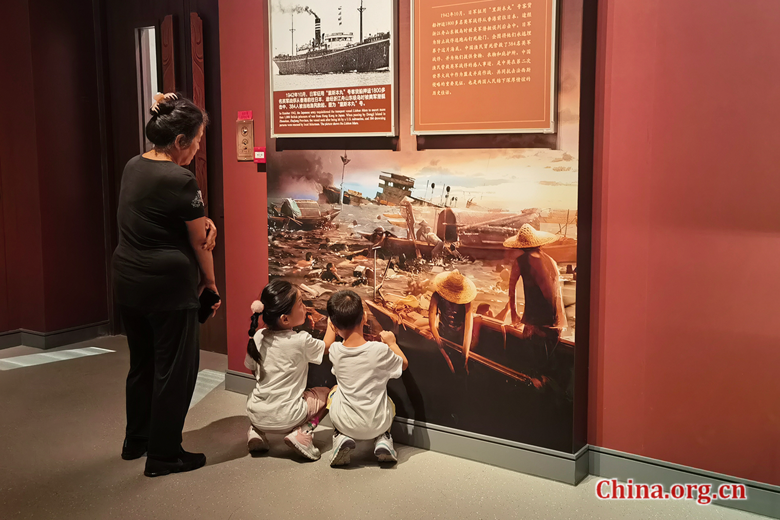 On Aug. 14, 2025, visitors study an artistic depiction of Chinese fishermen risking their lives to rescue British prisoners of war from the Japanese cargo ship Lisbon Maru. [Photo by Zhang Jiaqi/China.org.cn]