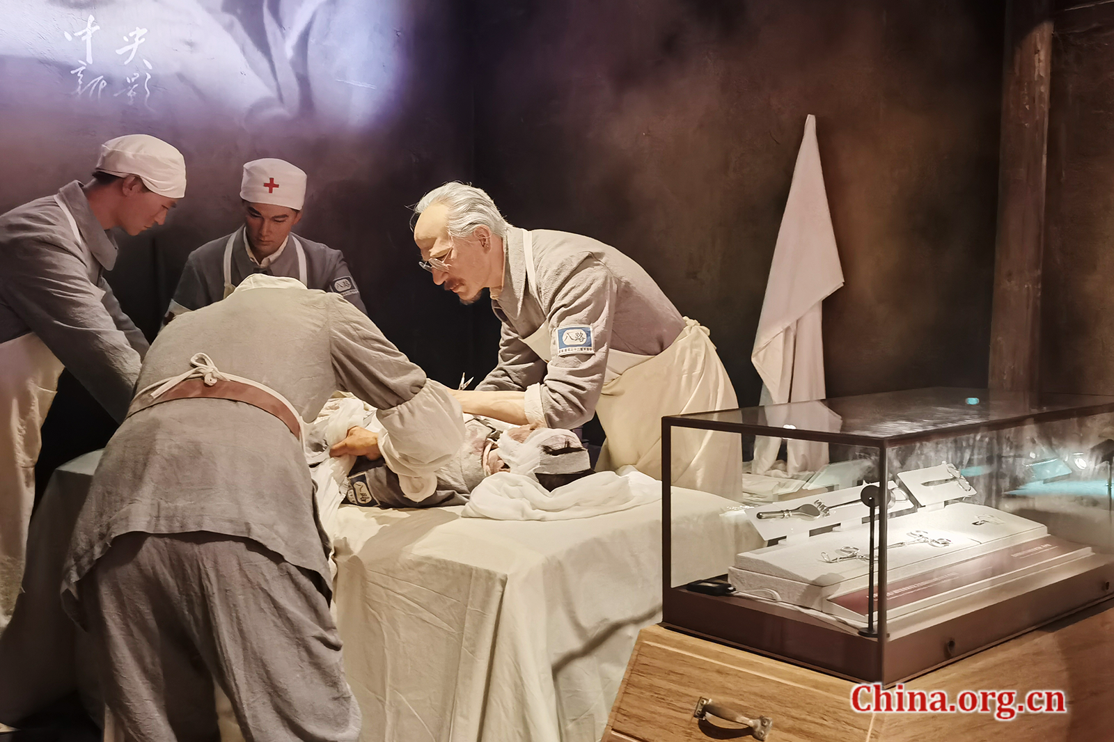 A wax sculpture of Canadian doctor Norman Bethune tending to a wounded soldier during China's war of resistance against Japanese aggression is on display at the museum, Aug. 14, 2025. [Photo by Zhang Jiaqi/China.org.cn]