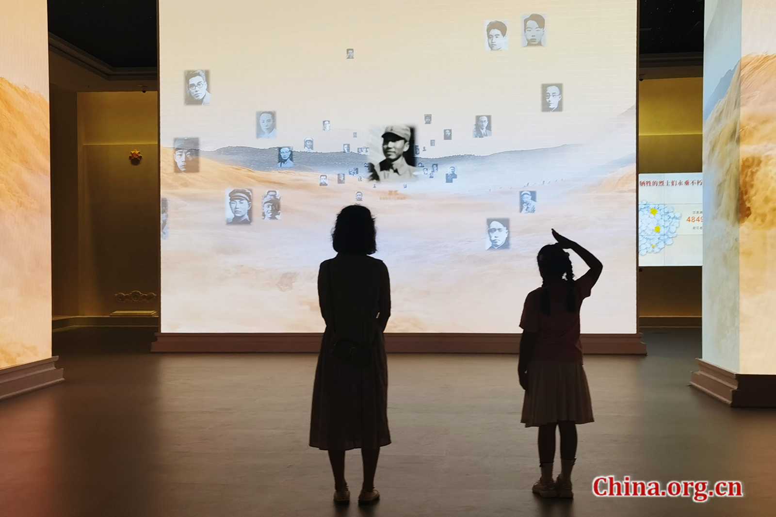 A girl salutes as she watches a video tribute featuring portraits of martyrs and heroes, Aug. 14, 2025. [Photo by Zhang Jiaqi/China.org.cn]