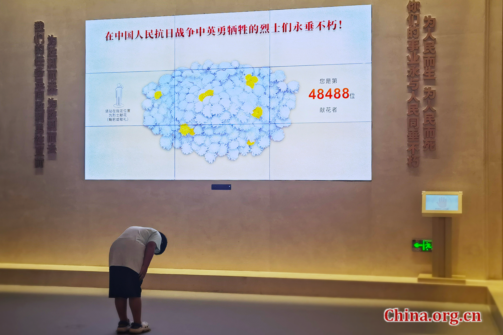 A boy bows deeply before a screen displaying digital chrysanthemum tributes to martyrs and heroes, Aug. 14, 2025. [Photo by Zhang Jiaqi/China.org.cn]