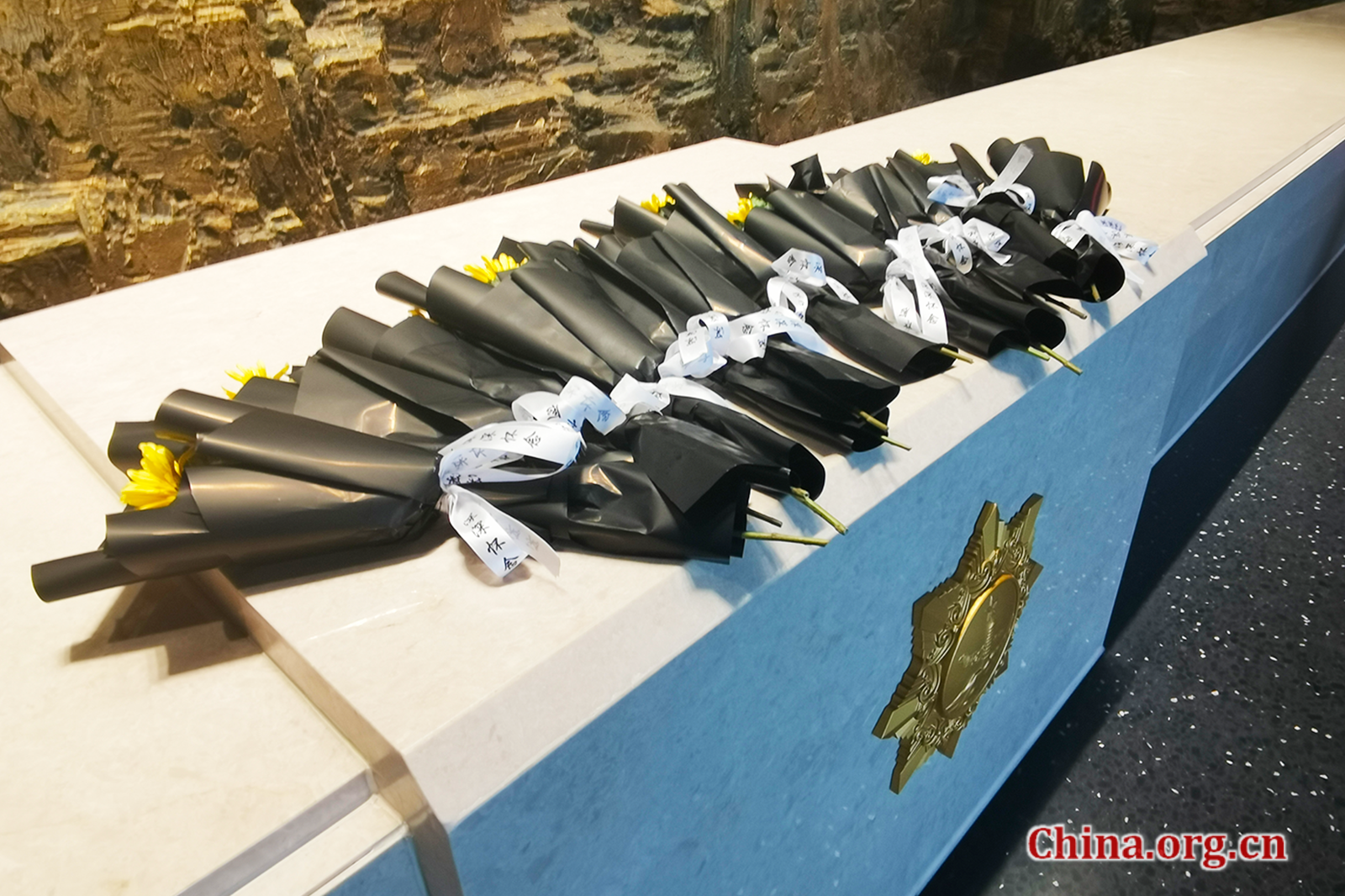A row of commemorating flowers line the base of the towering sculpture at the entrance of the museum, Aug. 14, 2025. [Photo by Zhang Jiaqi/China.org.cn]