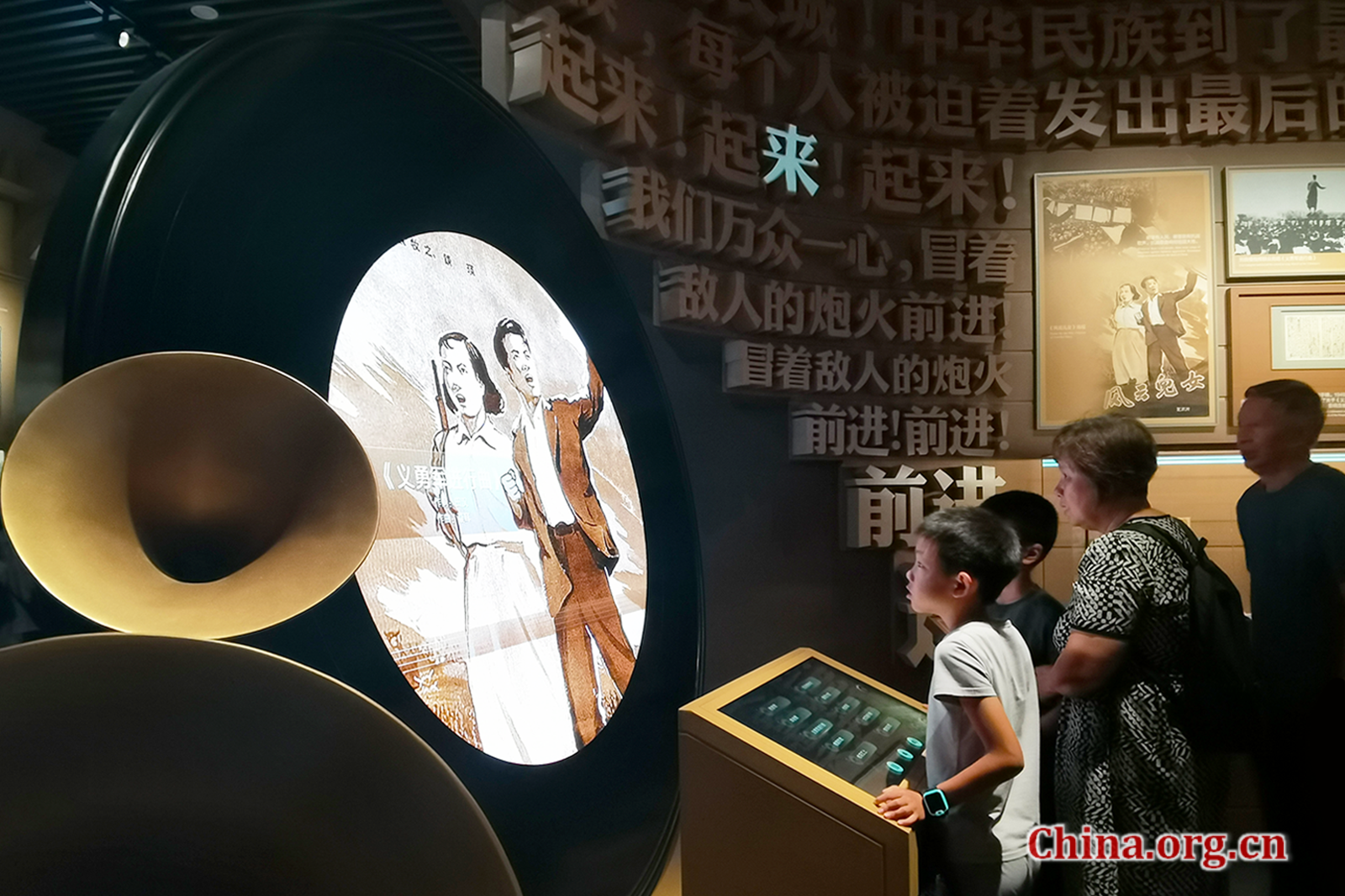 Visitors listen to the national anthem of the People's Republic of China beside an exhibition installation, Aug. 14, 2025. [Photo by Zhang Jiaqi/China.org.cn]