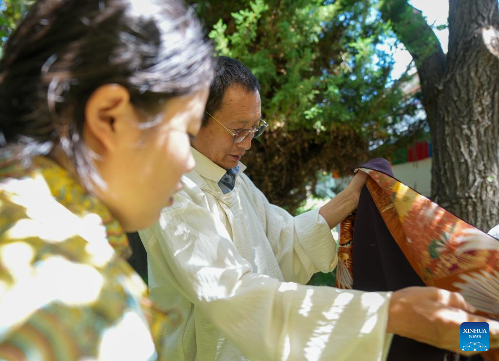 Losang Monlam (R) and an apprentice check a piece of finished Tibetan costume at the Sholdo Pal traditional handicrafts school in Lhasa, southwest China's Xizang Autonomous Region, Aug. 15, 2025. Traditional Tibetan costumes, after centuries of evolution and development, have formed rich styles and unique features. (Xinhua/Jigme Dorje)