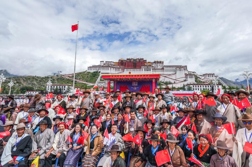 People wave flags during a grand gathering to celebrate Xizang Autonomous Region's 60th founding anniversary in Lhasa, southwest China's Xizang Autonomous Region, Aug. 21, 2025. Around 20,000 local officials and people from all ethnic groups and all walks of life joined in the celebration. (Xinhua/Jigme Dorje)