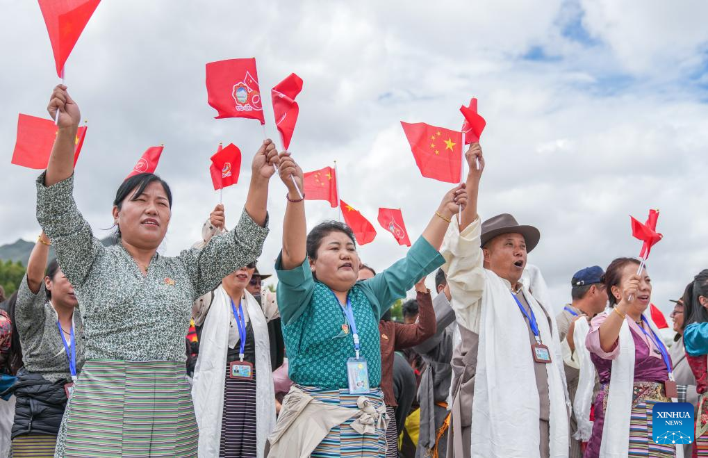 People wave flags during a grand gathering to celebrate Xizang Autonomous Region's 60th founding anniversary in Lhasa, southwest China's Xizang Autonomous Region, Aug. 21, 2025. Around 20,000 local officials and people from all ethnic groups and all walks of life joined in the celebration. (Xinhua/Tenzin Nyida)