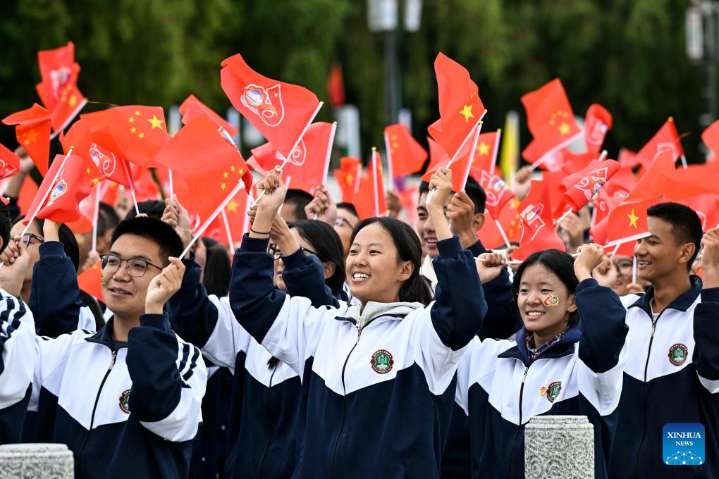 People wave flags during a grand gathering to celebrate Xizang Autonomous Region's 60th founding anniversary in Lhasa, southwest China's Xizang Autonomous Region, Aug. 21, 2025. Around 20,000 local officials and people from all ethnic groups and all walks of life joined in the celebration. (Xinhua/Shen Hong)
