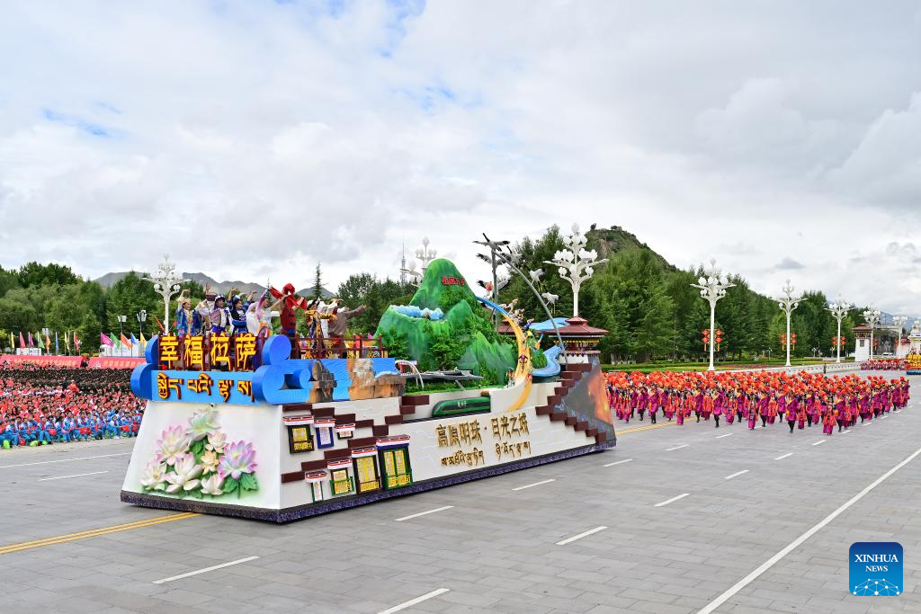A parade float takes part in a grand gathering to celebrate Xizang Autonomous Region's 60th founding anniversary in Lhasa, southwest China's Xizang Autonomous Region, Aug. 21, 2025. Around 20,000 local officials and people from all ethnic groups and all walks of life joined in the celebration. (Xinhua/Zhai Jianlan)