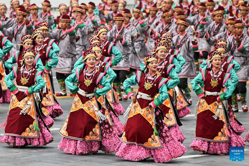 People take part in a mass parade during a grand gathering to celebrate Xizang Autonomous Region's 60th founding anniversary in Lhasa, southwest China's Xizang Autonomous Region, Aug. 21, 2025. Around 20,000 local officials and people from all ethnic groups and all walks of life joined in the celebration. (Xinhua/Yin Bogu)