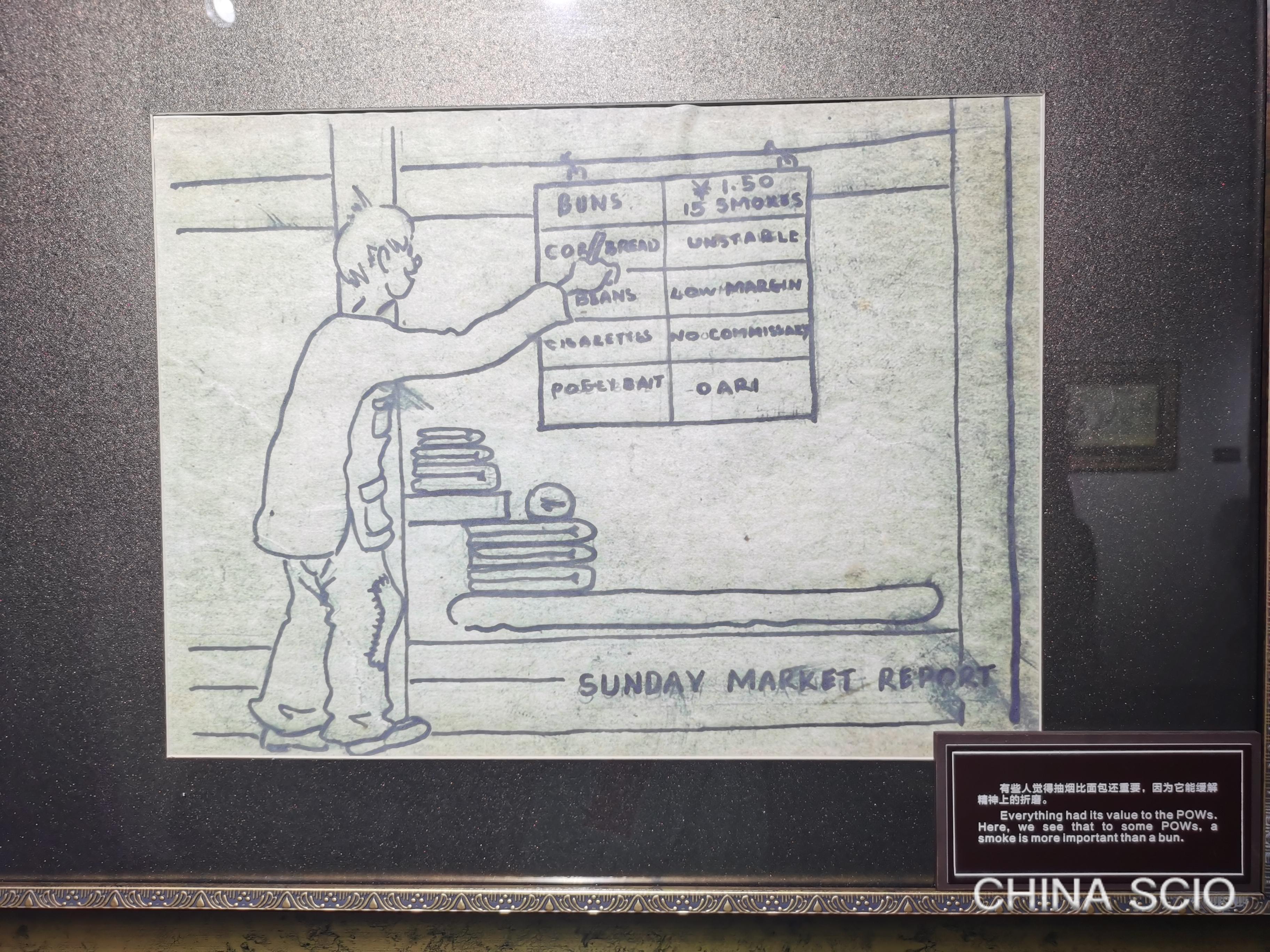 Another work reflects the mental stress that weighed on the POWs beyond physical torment, which illustrates a prisoner standing in front of what looks like a market price board. Labeled as "Sunday Market Report," the board lists items such as buns and cigarettes with prices and notes, mimicking a commodity market. The notes on the cartoon read that "to some POWs, a smoke is more important than a bun," as it could provide a brief escape from the relentless psychological strain.