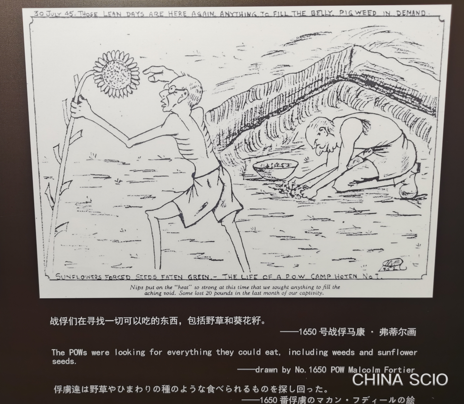 A cartoon about POWs searching for anything edible, displayed at the Shenyang WWII Allied Prisoners Camp Site Museum in Shenyang, Liaoning province. [Photo by Wang Xingguang/China SCIO]