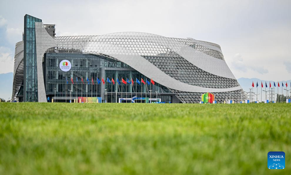 This photo taken on Aug. 28, 2025 shows an outside view of the venue of the seventh China-Arab States Expo in Yinchuan, northwest China's Ningxia Hui Autonomous Region. The seventh China-Arab States Expo kicked off on Thursday in Yinchuan, capital of northwest China's Ningxia Hui Autonomous Region, attracting more than 7,600 participants and over 2,200 enterprises and institutions from 75 countries and regions. (Xinhua/Feng Kaihua)
